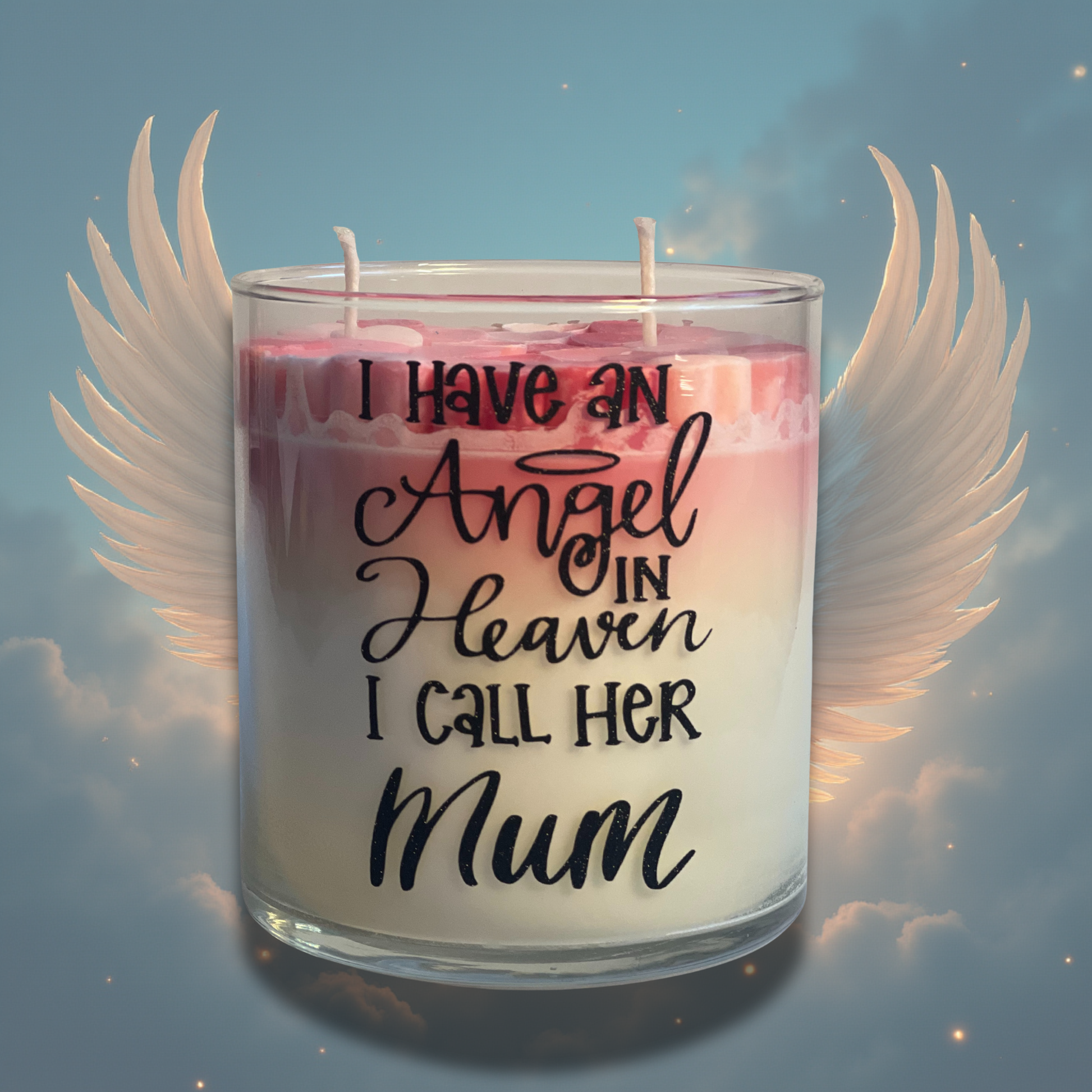 Honour cherished memories with this elegant memorial candle, crafted from soy wax for a clean, long-lasting burn. The "Angel in Heaven" creates a serene atmosphere perfect for reflection and remembrance. Hand-poured with care, this sophisticated tribute brings comfort and peace to any space, making it an ideal way to celebrate a life well-lived.