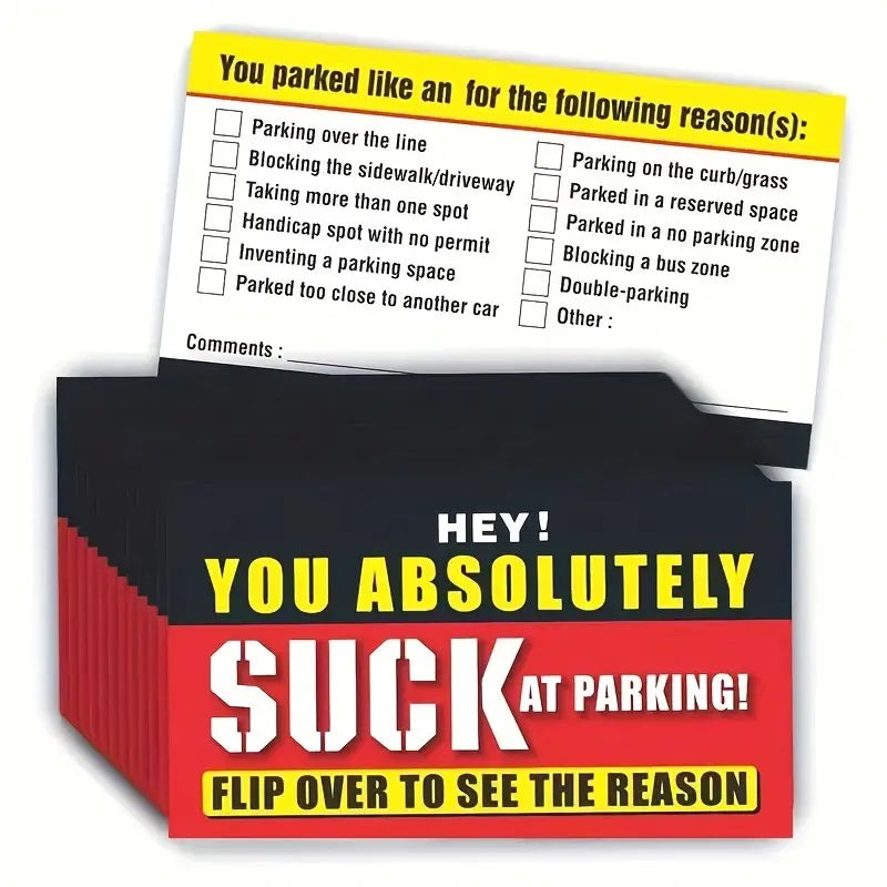 Ideal for targeting those who take up two spaces, block driveways, or park in no-parking zones, the "Suck At Parking" cards turn your annoyance into amusement. Whether you're looking to lighten the mood or simply share a laugh with fellow drivers, these cards are a fun way to call out inconsiderate parking while bringing a smile to everyone involved. Don’t let poor parking go unnoticed – grab your pack today and join the fun!